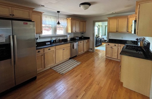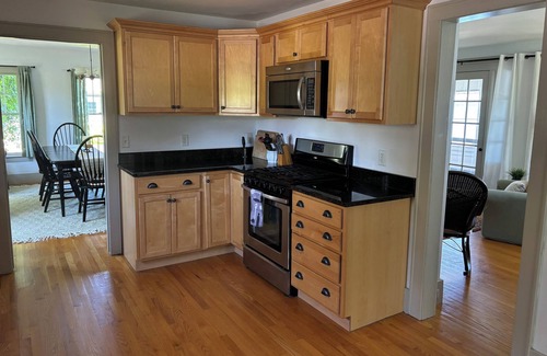 There are four bedrooms and two full bathrooms with tubs/showers. A bathroom is on each floor. The large bedrooms has a queen bed, two other bedrooms each have a double bed and the 4th bedroom has two twin beds. Two 'rollaway' beds (like cots with mattresses that are portable) can fit in any of the bedrooms. The fully stocked kitchen is large (approximately 20'x14') and has just been recently remodeled! It now has hardwood flooring to match the rest of the home, new gorgeous granite countertops with plenty of counter space, new light maple cabinetry, plenty of recessed lighting, and all stainless steel appliances including a gas range, microwave, dishwasher, and refrigerator. Our gourmet kitchen also has basic appliances such as a toaster, blender, garbage disposal, mixer, and coffeemaker. All kinds of cookware, dishes, utensils, and gadgets are provided. The house is on public water and sewer, has cable TV and a DVD player, and also high speed wireless internet. A first floor laundry is also a plus! Linens are provided, but are not your responsibility to wash for the next tenants.