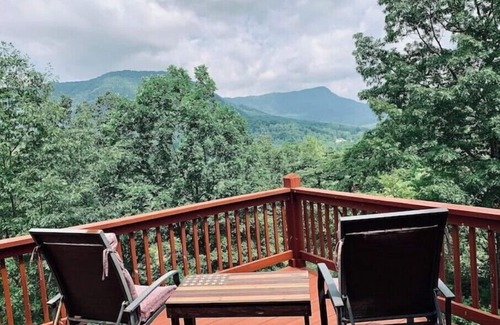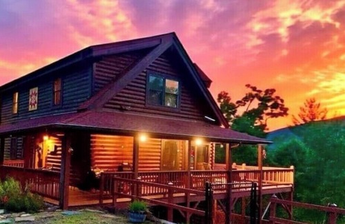 Relax with the whole family at this peaceful log cabin nestled on 10 acres wooded lot with stunning long mountain views in all directions. Upon entering the gated community, take a drive past 2 waterfalls and end at a private drive with no other houses in sight. Enjoy sunrises and sunsets upon the expansive 2 tier decks. Take a nap in the hammock under the trees , grill or use the smoker in the outdoor patio area. Fully stocked coffee bar. Bring your dogs for this trip, fenced yard.