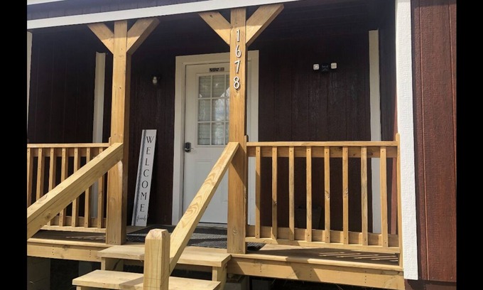 Secluded louisiana themed cabin with serene relaxing view of pine trees, fire pit area, spacious parking, gorgeous decor, front porch seating, backyard available workspace with WiFi, queen bed, and keyless entry.