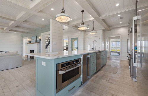 Welcome to the Casablanca where you will fall in love with our private beach located in Alligator Point, Florida! Sand awaits your toes in this completely reconstructed home that looks and feels like new construction with its nickel gap wood walls, handcrafted wood-beam ceilings, and white-washed wide-planked solid wood floors. Upon entry, you are immediately greeted with views of sea oats and our snowy white sandy beach. The spacious open floor plan has a chef's kitchen inclusive of a double oven with gas stovetop, both a full-size standalone refrigerator and freezer, and an ice maker. Two pantries allow for plenty of storage. The beautiful 10-foot solid wood table opens to the spacious living room with a huge sectional that you can easily relax in after a "hard" day at the beach. The upstairs master suite with a king bed has a private balcony and a luxurious oversized shower that provides unobstructed Gulf views. The large downstairs master suite also has a king bed with a sitting area and floor-to-ceiling windows overlooking the beach. The third master suite with a queen bed is connected to a second family room that provides bay views and has a comfortable pullout sofa when an extra bed is needed. The west wing has a fourth queen bedroom with both gulf and bay views and shares a bathroom with the bay-view bunk room. Never-ending hot water thanks to the tankless Rinnai hot water heater. Enjoy outdoor dining on the covered back porch. There are two washers and dryers (one upstairs and one downstairs). We provide Free high-speed Internet. We also have 5 Smart TVs throughout the Casablanca.