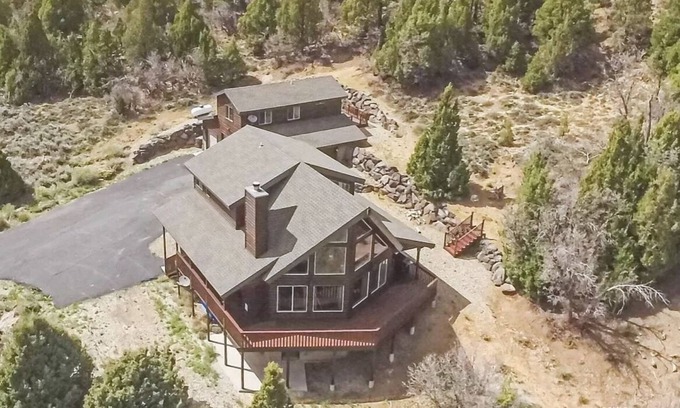 This cabin is situated in the Elk Ridge sbudivision, with paved roads and year-round access. Treat yourself to this spacious, luxury cabin in a wooded rural setting. This 3200 square feet cabin is ideal for up to 10 guests. The great room offers a huge wall of windows, floor to ceiling stacked stone, wood-burning fireplace, ample seating, and a XL Flat screen to enjoy TV while catching your favorite show. The main level also features a gourmet kitchen with all the cooking utensils, appliances, dishes, pots & pans, and spices you'll need. The coffee bar is a morning favorite while you sit and enjoy the views of the valley. The main floor includes a half bath and a full laundry room. Make your way upstairs for views that won't disappoint from the sitting room just outside the primary bedroom. Enjoy the tranquility of of this private suite with a cozy king bed, and 5 piece ensuite bath complete with 2 person jetted tub. Downstairs hosts two queen bedrooms and full bath, and additional sitting room with two bunkbeds, a couch, and games for all to enjoy. Parking is ample and has plenty of room for all of your toys! Attention to detail and upgrades throughout this gorgeous chalet-style cabin.