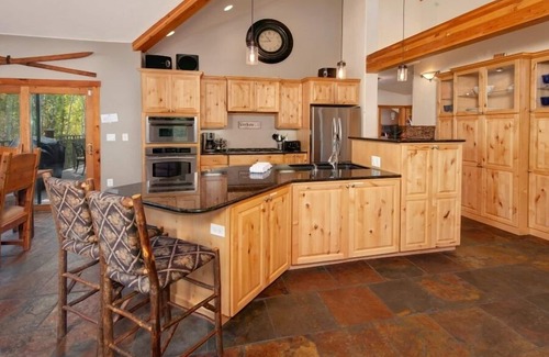 The main floor of The Aspen Grove features an open kitchen, living and dining area. The kitchen features all stainless steel appliances, double ovens, granite counter tops, and slate tile. The kitchen is stocked with all the cooking utensils a chef could need for a meal large or small. The adjacent dining table seats 6, with additional seating for 2 at the bar. There is a gas fireplace in the living room, vaulted ceilings, a flat screen HDTV.