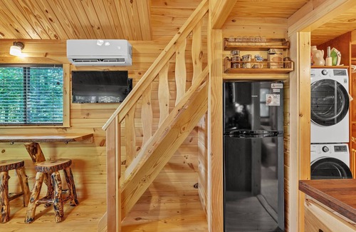 Spruce Cabin's structure and interior finishings are all hand-built from knotty Pine which allows for a traditional log cabin aesthetic. The square-milled, insulated tongue & groove construction presents a rustic feel, with modern efficiency and cold-climate performance. The cabin is heated and cooled via two electric heat pumps (mini-splits). Stepping inside, the open floor plan provides a larger feeling of space than the tiny dimensions would suggest, with the living room being open to the kitchen and sleeping loft above. There is a double-sized convertible futon with a high quality mattress that comfortably sleeps two. A window-height table serves dual purposes as a dining table and work desk, as does the kitchen island/bar. A wood stove sits on a custom stone hearth for warmth and ambiance and a smart TV offers access to streaming entertainment. A stairwell from the living room leads to a low-ceiling sleeping loft with two twin mattresses to accommodate an adult couple or two children. Walking through the hallway from the living room, guests will find a full bathroom with stall shower to the right, and a large walk-through closet with washer & dryer on the left. Located at the end of the hallway is the master bedroom, featuring a queen-sized bed and a full sized dresser + chest of drawers. Outside, guests will enjoy the semi-enclosed 10x10 covered porch, an open deck/patio with firepit, along with full access to the 10-acre Woodshed Lodge property including the stream-fed pond and outdoor hot tub. Spruce Cabin comfortably sleeps two couples plus 1-2 children, or could accommodate up to three couples who are comfortable with sharing a small space and a hot water tank designed for 4. Cabin guests will always enjoy full access to the lawn, pond, and surrounding wooded property. Additionally they will often be offered limited access to main lodge building, dining room and hottub.