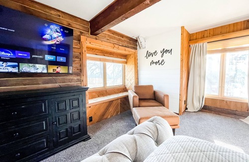 This one of a kind log home is your next home away from home. Best described as "cozy and cute", we invite you enjoy all that Colorado has to offer with our gorgeous sunrises and even more breath taking sunsets behind Pikes Peak- all available to enjoy from your front or back porch or even from the primary bedroom bed! Wake up hearing the birds in this quiet home situated on the back of an 8-acre lot. This home is neighbors to our guest cottage, also on the property (inquire to book both for larger parties!) Walking into the home you will immediately notice the authentic log home structure with exposed posts and beams. This home was built in the 70's but has been newly renovated to accommodate all of you and your families needs. The living room is flanked by large windows facing Pikes Peak. Walk directly into the dining room where you will be greeted by a charming wood burning stove and large sliding glass doors to let nature in. The kitchen overlooks the dining room with a large peninsula. There is a big window over the sink to watch the herd of deer grazing every evening while you do dishes. The kitchen has all stainless steel appliances and is stocked with everything you need, including spices, to create a family meal. There is a half bath on the main level as well. There is also a 65" tv in the living room equipped with the most current streaming services. Head upstairs where you will find a game room- there is a fooseball ball table and a table that has games for the family. Off the game room is the bunk room with a full over full bunk and a twin trundle. This bedroom is connected to the primary bedroom via the jack and jill bathroom. It also has a second entrance through the game room. The primary bedroom is luxurious in that it has its own balcony to enjoy a cup of coffee in the morning. It has a 65" tv complete with streaming services, breathtaking views of Pikes Peak (enjoy them from the comfort of your own bed!), a leather chair and ottoman, and a leather large bean bag that converts into a queen sleeper for the kiddos. Head to the basement where you will find a second living room to relax and hang out, a full size washer and dryer, a bathroom with shower/ tub, and three bedrooms. One bedroom has a king size bed and tv with streaming services, the other two have queen size beds. This is a unique and beautiful home that will make you feel like you are in Colorado.