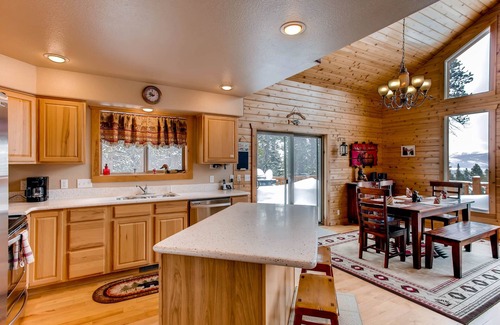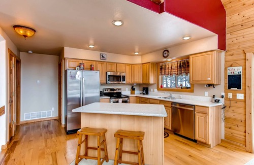 Walk up the stairs to the Great Room where you can enjoy high vaulted ceilings and floor to ceiling views of the surrounding woodlands and distant peaks. The spacious Living Area has comfortable leather couches centered around a wood-burning fireplace and majestic stone hearth all open to the Dining Area and the bright and cheerful Kitchen. The Dining space has a large table with comfortable seating for 6, a sideboard and walkout access to the propane BBQ grill. The well appointed Kitchen has custom cabinets and countertops, numerous cooking gadgets and high-top seating for 2 at the bar - the perfect place for whipping up your family's favorite meal! Just beyond the Kitchen, the Mid-Level Bedroom offers large windows, a Queen bed, a corner Twin and a large storage closet. The Mid-Level Central Bathroom features a standard vanity, toilet, corner shower and full size washer and dryer available for guest use - So no need to waste precious vacation time at the laundromat in town!