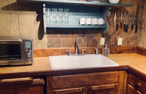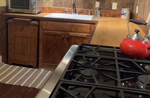 Continue on into the eat in kitchen- with a long table that can seat 4-6. The kitchen is equipped with a chefs stove, commercial refrigerator, porcelain farmhouse double bay sink- and plenty of pots, pans, and utensils to cook up most anything. The kitchen is rounded out with a toaster oven and even an milkshake maker in one of the cabinets! The half bath is right off of the kitchen.
