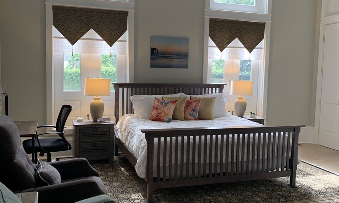 This 7500 sq. ft. house is walking distance to restaurants and beach. Large porches with views. Secluded fenced yard with patios, gardens and a pool. Private off street parking exclusive to our guests. Six suites each equiped with with Roku loop TV's, microwaves, Keurigs, mini fridge and walk-in closets. Large common areas, intimate library, chefs kitchen. We are willing to do corporate rentals as each room has individual keypad locks.