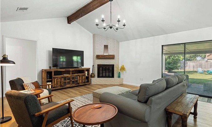Kick back and relax in this calm, stylish space. Only 10min to Magnolia Silos, Baylor, and downtown Waco. Older, very quiet, and safe neighborhood, with easy access to I-35. Soak in the private inflatable hot tub. Pet-friendly, so your pups can run the entire length of the fenced-in double-lot. Light the wood-burning fireplace and cozy up on the couch to watch your favorite movie on the 65" TV. Open floor plan from kitchen to living room, so you can easily spread out and visit.