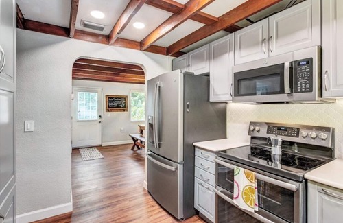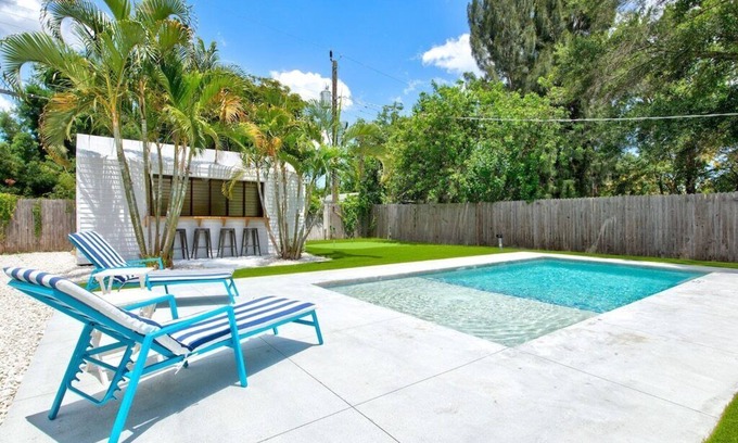 Imagine life in a tropical oasis-surrounded by palms trees, turfed lawn and putting green while enjoying the Florida sun relaxing your private saltwater heated pool with extended sun shelf. This 3 bedroom/2 bath 1940s bungalow is a great place to relax and unwind with your own resort style backyard. The fully equipped home, located between downtown Bradenton and Anna Maria Island offers fun in every direction. We guarantee you'll want to stay awhile!