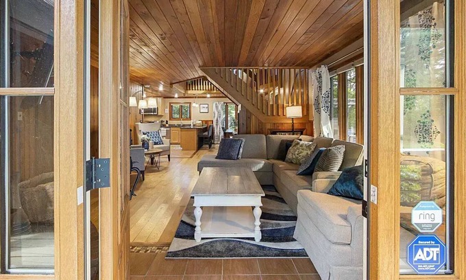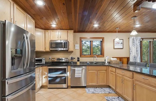 This three-story home with beaming wood ceilings, and a catwalk loft overlooking an open concept kitchen and living room offers plenty of space for the whole family! With 1 king-size bedroom, 3 queen-size bedrooms, another private room with queen bed plus daybed with twin size pull-out trundle, and 3 full bathrooms, there is plenty of space for 12 guests to sleep comfortably. (More guests are allowed for an additional fee).