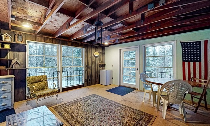 Step into this delightful cottage and be welcomed by wood-paneled living areas bursting with plush seating, a whimsical spiral staircase, and artful rustic decor. Snuggle up by the fireplace with some cocoa and a good book as the snow falls outside. A full kitchen boasts modern appliances and plenty of storage space for effortless food preparation. Gather for delicious home-cooked meals at the dining table and then break out the card games. Even better, challenge a friend to a pool tournament! A three-season porch includes a mini-fridge for those who prefer hosting in an even more picturesque setting. After a full day of mountain adventure, unwind on the deck, sharing some local brews and lots of laughter as the starlight illuminates the serene landscape.