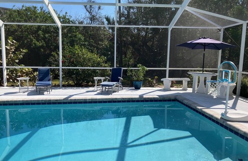 neighborhood. Fully equipped kitchen. Only a short 3 block walk to the no drive beach. Large screened pool, fence and foliage make pool area totally private. Listen to the waves as you float in the pool or lounge on the cozy patio. The perfect location to relax and unwind. Short & long term renters welcome. Great for home schoolers.