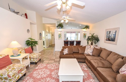 Beautiful screened-in, solar heated pool! Free WIFI. Huge great room with breakfast bar, three bedrooms, two bathrooms, a full and totally equipped kitchen including microwave, smooth-top range, dishwasher, side-by-side refrigerator with ice water, ice cube, and crushed ice dispenser in the door. The laundry with new high-capacity washer and dryer is located inside and we have supplied you with an iron and ironing board.