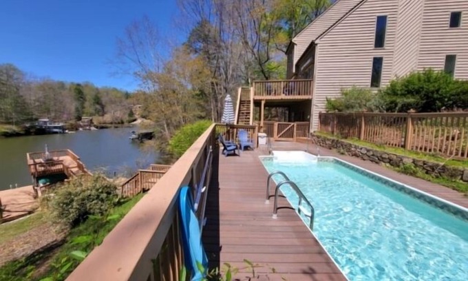 Private pool and hot tub, paddleboard. Huge sundeck and dock with usable power at the dock and swim ladder. Ping pong table, wifi, 4 smart tvs, gas grill. Impressive vaulted ceilings coupled with the professionally decorated clean, elegant, lake theme give a feeling of richness to this home. Oversized bedrooms ensure plenty of room to spread out and make the place your very own for your trip. The main level has an open floorplan, with the kitchen, living room and dining room open to one another that allows for the whole family to enjoy cooking, having dinner or just relaxing in front of the tv. There is a table on the deck overlooking the peaceful cove if you prefer to grill and eat outside, or enjoy the screened in porch off the deck. There's also a full bath (shower) on the main level.
