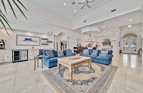 Imagine a stunning 3,400 sq. ft. home located within a gated access offering almost an acre of land that seamlessly blends luxury with coastal charm. "Lucky View" is a beautiful 3 BD | 3 BTH home that comfortably sleeps 15 people and offers plenty of room for both relaxation and entertaining. Upon entering, you're greeted by an open-concept living area with high ceilings and expansive windows that flood the space with natural light, providing breathtaking views of the bay. The house is adorned with exquisite ceramic sculptures and elegant spiral columns throughout, creating a refined and sophisticated ambiance.