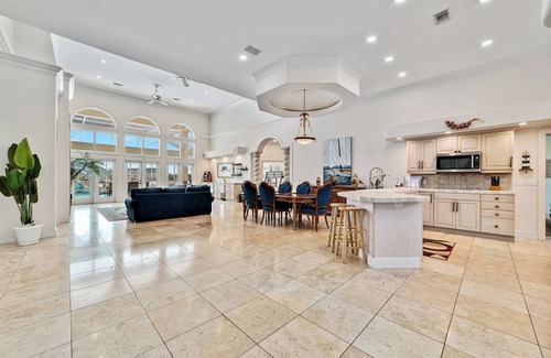 The same stylish decor extends to the exterior, seamlessly blending with the overall elegance of the home. Equipped with top-of-the-line appliances, a kitchen island, and custom cabinetry, the views of the bay from the kitchen are a chef's dream. The master suite is a sanctuary in itself, with its own french doors leading out to the screened-in salt water pool area overlooking the bay, as well as a luxurious en-suite bathroom equipped with a walk-in shower, double vanity, and a jacuzzi tub! The additional bedrooms are equally inviting, each with their own en suite bathroom ensuring comfort and privacy. The living and dining areas flow seamlessly to the outdoor spaces, where the true gem of the home awaits: a spectacular screened-in salt water pool area. The screen enclosure ensures that you can relish the poolside experience without worrying about bugs or debris, while still offering unobstructed views of the stunning bay. Additionally, it provides ample space for lounging and entertaining as it is equipped with a propane grill AND outdoor speakers, making it an ideal spot for relaxing or hosting gatherings. Straight back from the pool area is a well-designed deck that leads directly to a private boat dock. This exclusive feature offers immediate access to the water, making it ideal for boating enthusiasts and providing a convenient spot to tie up your vessel. A cleaning station is also available on the dock! Bring your fishing poles for some of the best fishing right off the dock! The home's exterior is just as impressive, with landscaped gardens and a blend of contemporary and coastal architectural elements that enhance its appeal. Overall, "Lucky View " is a perfect blend of indoor and outdoor living, offering an unparalleled lifestyle with its direct bay access, private boat slip, and stunning salt water pool area. Book your stay today and start making memories that will last a lifetime.