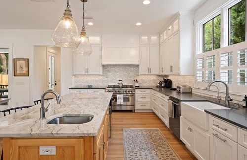 A few steps up onto the covered front porch with ample seating. Enter the home into an open concept living space. From here you have a clear view to the pool and gathering spaces. To the left is the large family style kitchen with tons of counter space. Kitchen features a 6-burner gas range, stainless appliances, microwave, beverage cooler, and single serve Keurig.