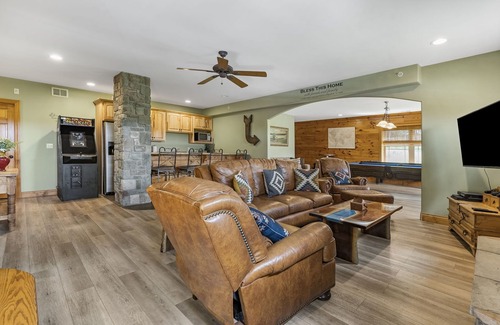 This vacation rental offers lots of space to spread out. You have 9 fabulous bedrooms, and 5 living areas - the main living room, the lower-level living room, the pool table room, the game room and the office room AND a newer theater room. We have also added your own private pool (NOT heated) right behind the home! You have a fully stocked kitchen with all you will need to prepare your meals, and a gas stove too! For entertainment you have a pool table, foosball table, ping pong table, air hockey table, outdoor basketball hoop, mini golf course, fire pit, outdoor pickleball court with full sized basketball court, PS4, games and movies, and the theater room (a separate designated room with projector and large screen! The location is amazing, just 2.5 miles off of 65, within ten minutes of the 76 Strip! So close to all of Branson's activities yet your own space. 20 minutes from Silver Dollar City. Free Wi-Fi. There is also a crib and a pack and play available.