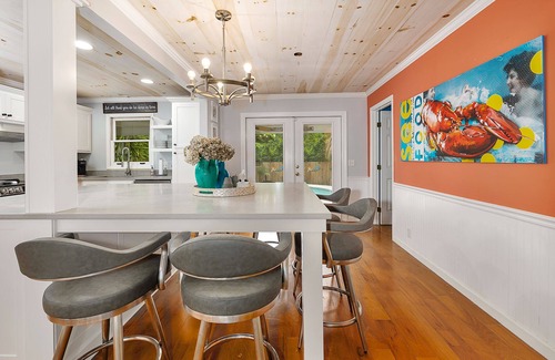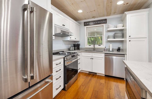 The open-concept kitchen, dining and living room have been completely renovated with beautiful white Shaker cabinets, new stainless steel appliances, fully-stocked kitchen and solid surface countertops. The fun bright colors of the home will put you on island time from the second you walk in the front door.