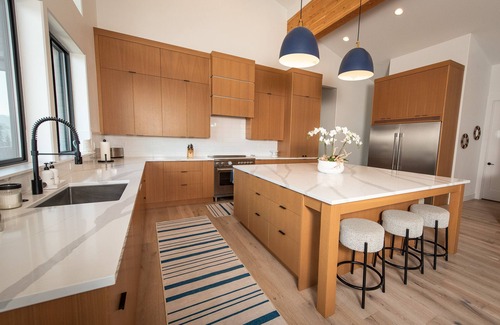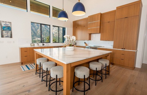 The pristine, light and bright kitchen features generous and gorgeous countertops and enough amenities to accommodate family meal prep and plenty of appetizers. It also provides more dining space in addition to the dining table. This dreamy chef’s kitchen includes an oversized sink, induction stove/oven combo, icemaker and extra-large fridge/freezer that makes it easy to cook up your favorite meals and host holiday dinners for your group.