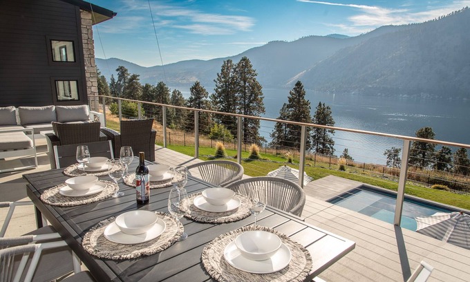 At Lake Chelan Vacation Rental (LCVR), escape to your own private oasis just minutes from downtown Manson in this luxurious, newly built home boasting seclusion, a private pool, and breathtaking panoramic views. With a clean and crisp coastal design, this high-end retreat offers an incredible stay for guests.