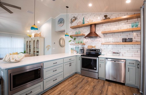 The first bedroom has a queen bed and bath. Second bedroom has two full beds with a private bath. The tranquil master suite has a king bed, large his/her closets, walk in shower and a double vanity with quartz countertops. There is a large open area for dining, games or just enjoying the views. In the living room you will find two full couches and two comfy chairs. The kitchen is uniquely designed with a beautiful tile backsplash, floating shelves and quartz countertops.