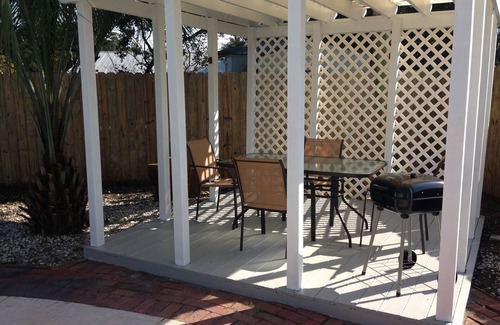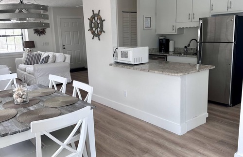 Are you ready for summer at the beach?! Our cozy beach house offers comfortable accommodations for families up to 7. We recently renovated the entire house featuring a fully stocked kitchen with granite countertops, new luxury vinyl flooring throughout, new bathrooms and perfectly-appointed beach decor that your family will adore. The master bedroom features a luxurious king bed, 32-inch HDTV and private entrance to a private bathroom with standing shower. The second bedroom offers a bunk bed with a twin and full bed which accommodate up to 3 grown children or adults, or 4 small children. This bedroom has direct access to the second full bathroom which offers a tub and shower combination. The cozy living room offers an overstuffed love seat, queen sleeper sofa that sleeps 2 and a large flatscreen TV. The dining area overlooks the kitchen with granite counters and open floor plan. The stocked kitchen offers amenities for all your cooking needs including an oven, dishwasher, coffeemaker, toaster, pots and pans, dishes, flatware, glassware, grill tools and more. The adjacent bar overlooks the sunny Florida room which boasts floor to ceiling windows with views of the pool. Sliding glass doors lead out to the backyard oasis where you will find a private pool, lounge chairs, outdoor dining area with a charcoal grill, gazebo and palm trees for a tropical backdrop. It's the perfect area to unwind and relax. Guests have access to wireless Internet and digital cable. Don't feel like checking a bag? No problem! Our washer and dryer will let you clean your clothes so you can travel light.