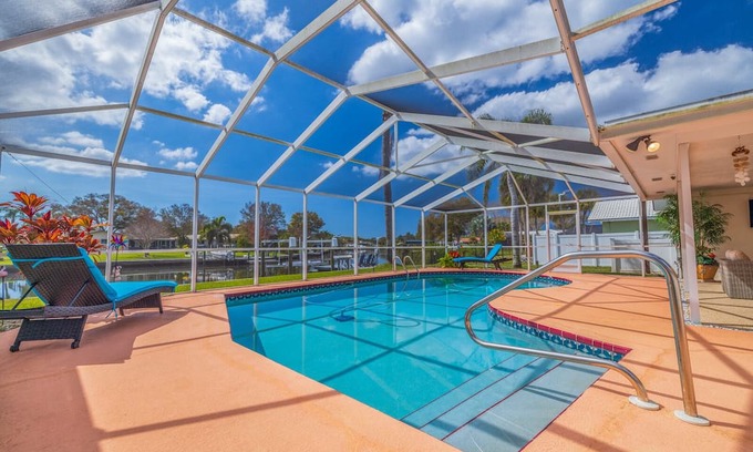 Outdoor Oasis: fully screened in area with heated pool, resort style sitting area, ceiling fan. TV, fire feature, dining table, sun loungers all overlooking the waterway with dock and Adirondack chairs, there's also a nice green space with grass between the screened in pool area and the seawall