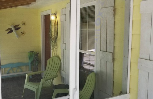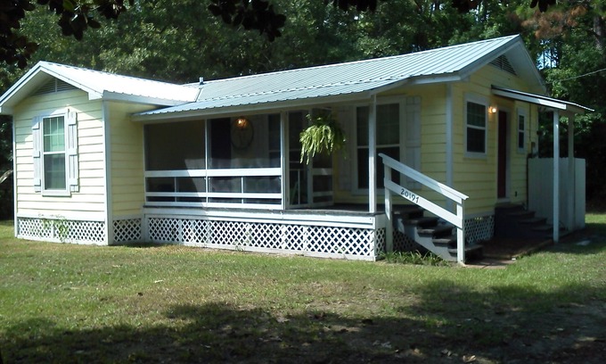 Everyone loves our little Sunshine Cottage !! You won't find another place like this. Kinda small, not new...but you won't want to leave. It's a beach cottage off the beach...in a wooded setting surrounded by trees and green grass. House is about 3 miles from the beach, so close to everything. But you can leave the traffic behind. We have 4 homes in the neighborhood, and we've been honored with over 300 five star reviews. Fenced backyard for pups!! Sleeps 5, one queen , one full, and one twin beds. Completely furnished and ready for you. All bedding furnished , bring your towels. Everything else is here. Kitchen is fully equipped, with washer and dryer also. Sit on the screen porch and relax in tranquility.