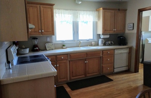 Bright airy ranch home, located in a quiet lot off the main street, with a private driveway. Three steps to the main entrance. The house has 3 bedrooms: the first is master bedroom w/ queen bed, second bedroom has 2 single beds, and the third bedroom has a queen bed. The house has 1 and a half bathrooms. There is a large living room adjoining the dinning area. Large kitchen with essential appliances included. Washer dryer/detergent available. Parking for 6 cars.
