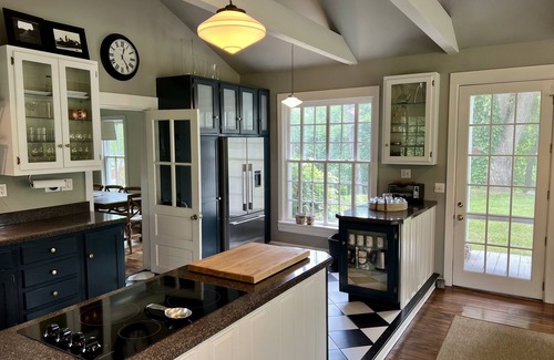 A Walk Along The River - stylishly renovated farmhouse with park like private yard surrounded by wooded State Park Land. Located on a quiet 2 mile cul de sac running along the Hudson River with multiple entrances to walking trails. The property offers full privacy. Enjoy your morning coffee on the front porch peeking at the river, enjoy an al fresco lunch under the shade of a magnificent wood pergola with large custom built concrete tables. Have a lazy afternoon reading or napping in hammocks shaded by large Mulberry trees, and relax in the evening with drinks on the back patio under a retractable awning. Night time star gazing can be enjoyed lounging in the Adirondack chairs surrounding the stacked stone fire pit while enjoying the glow and warmth of a campfire in your own back yard.