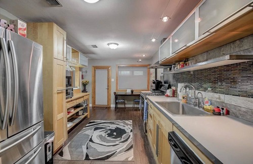Revisit a 1960's Austin neighborhood in this Newly renovated and impeccably clean 3 bedroom, 2 bath home. Located less than 5 minutes from Downtown Austin, this Contemporary remodeled home boasts a state-of-the art kitchen, a lighted bar in the kitchen/family room, open floor plan living, spacious bedrooms with 3 Queen beds, 2 full bathrooms with tub/showers. Perfect for entertaining both inside & out with deck, separate deck next to the woods, & private backyard. Stunning creek side location has a hike & bike adjoining the property. Easy freeway I-35 access and just minutes from all that Downtown Austin as to offer - live music & entertainment, restaurants, ACL, SXSW, Reggae Fest, and much more! Close area attractions include McKinney Falls State Park, Zilker Park (free concerts in the park in the summertime, water activities on the Colorado River), Auditorium Shores (more free music concerts), and Formula One. Please note that there is an owner's suite attached to the main house with a separate entrance. This area is not a part of the rental. There are multiple exterior security cameras and a ring doorbell in operation.