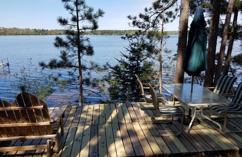 Great private lot with huge shade trees, large yard for yard games, and 200 feet of private lakeshore. The lakeside deck includes a dining table with chairs, and glider. Such a great spot for reading, an afternoon nap, watching the loons, a memorable meal, and catching a glorious sunset.