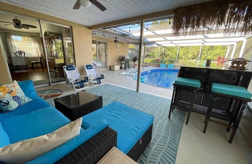 Relax and restore at your own retreat, the Salty Seahorse! Rejuvenate as you listen to the songbirds in the tranquil lanai that overlooks the private pool & backyard. The screened-in outdoor oasis Mermaid Lounge, is equipped with a BBQ grill, mini-tiki bar, and all the pool-side comforts. Nestled in the Sea Pines Gulf access community (a designated bird sanctuary), this spacious 2 bedroom, 2 bath, home welcomes you. A full-size office, pantry, large bedroom closets, fully-applianced kitchen, and a garage with washer and dryer add to the bonus features.
