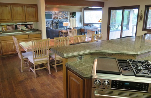 Located in the Northern River Village area of Sunriver, this large, secluded, luxury 5-bedroom, 5.5 bath home sleeps 10 and is an entertainer's and explorer's dream! Great for family gatherings and ski weekends. Large open great room with wet bar; adjacent dining room and open gourmet kitchen with island bar, featuring picture windows and surrounded by a wide wrap-around deck overlooking partial riverfront and mountain views. Huge luxury master suite with fireplace, and two more suites featuring king size beds and adjoining bathrooms. Remaining two bedrooms, each with a queen bed and twin bunk beds, share a Jack-and-Jill bathroom. The house also includes a family room, large outdoor hot tub, gas grill, and downstairs deck with outdoor dining area. HD televisions in the great room, family room and master bedroom - three more TVs in the guest bedrooms.
