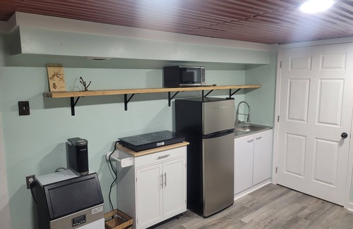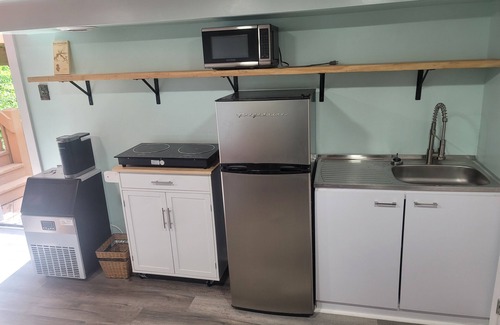 Small efficiency pull out couch to sleep on ,microwave, fridge and a hot plate and a grill .This room is on the lake with a view of dale hollow lake is 5 miles from sunset dock marine there are boat rentals and plenty of restaurants to eat at as well as fishing and boating.