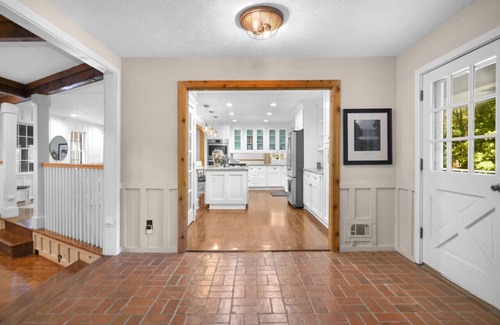 The main entrance to the home is on the second level where the social entertaining areas and 5 bedrooms are located. The estate’s large, open format kitchen is outfitted with high end appliances including a 6-burner gas range, double ovens, and pantry as well as a premium housewares and appliances package for serving to any size group. An island with bar seating is awash with the glow of suspended pendant lights offering a perfect area for morning coffee from the Kuerig or overflow seating during events. An elegant dining area with a farmhouse style table completes this space. Adjacent is a cozy den with classic stone fireplace and French doors that allow for a seamless flow directly to an expansive porch/balcony with outdoor fireplace and lovely views of the forest and in-ground heated pool.