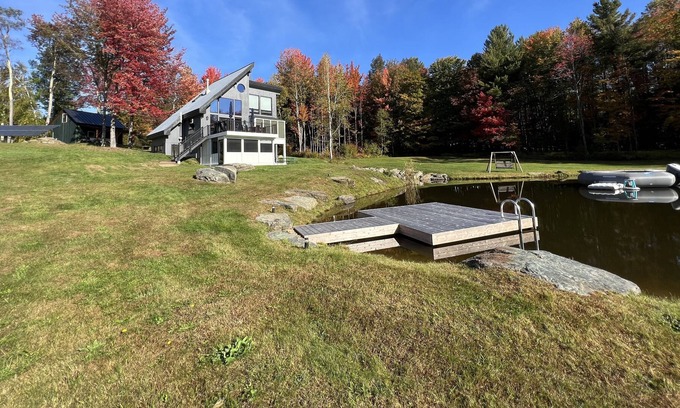 This charming four bedroom post & beam, three bath home sits on 4 acres of private gradually sloping lawn with direct views of the Worcester mountains and the epic Stowe Pinnacle. Guests will love its double-faced fireplace, unique spaces and convenient location, just 2 miles from downtown Stowe. Swim in the large spring-fed pond, walk the secluded grounds, or sit back relaxing around the fire pit. Enjoy backup power with a solar array and Tesla Powerwall to keep the lights on during a storm.