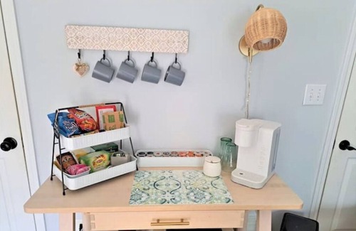 Your room is easily accessed from the driveway, with a private entrance. With the dry kitchen (no cooking facilities) we provide a Keurig coffee maker, microwave, mini fridge, and small dining table with two chairs. You have a sofa and coffee table for additional comfort.