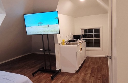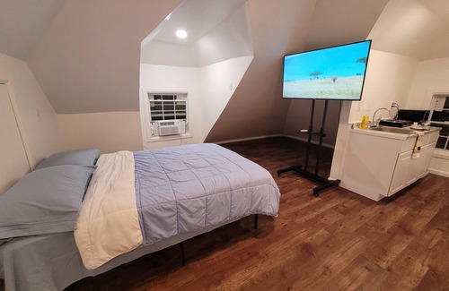 Private studio apartment with own bathroom, shower and kitchenette. There is window air conditioner. There is also a microwave also flat screen TV and a private entrance to your room. 8min from EWR!!