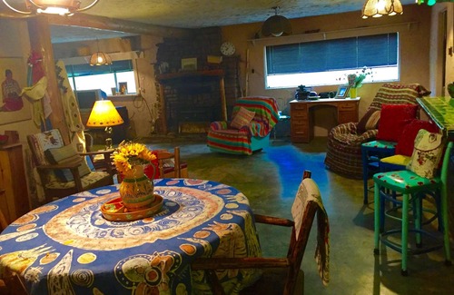 The Studio is ... colorful , whimsical , Ethnic , eclectic, Bohemian , lovingly adorned with flea market treasures and antiques.