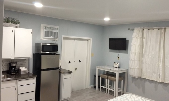 Studio has been completely renovated. Studio, supporting up to 2 guest; has kitchenette, shower, toilet, refrigerator with freezer, AC unit, TV, closet, drawers, table & chairs with common seating area outside. Laundry service available for additional fees.