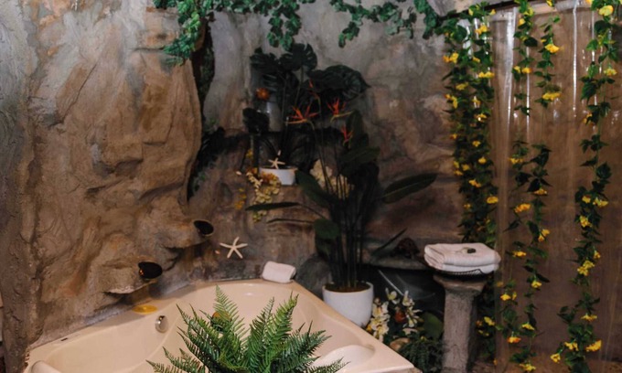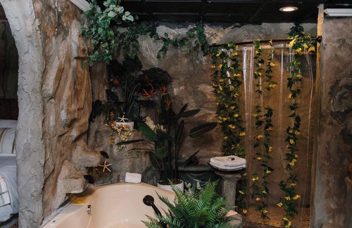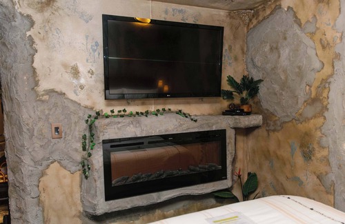🏨💕 Suite for 2, perfect for honeymoons or romantic getaways! Our Lagoon-themed room with two-person “air-jet” tub, exotic waterfall shower, queen bed inside a cove, wall fireplace, mood lighting, 55” flat screen Apple TV, and natures furnishings. (medium/firm bed). 🍴. Hot Breakfast delivered to your room (between 9-10am) upon request. 🥐🍳. Ideal for couples seeking a cozy retreat 😌.