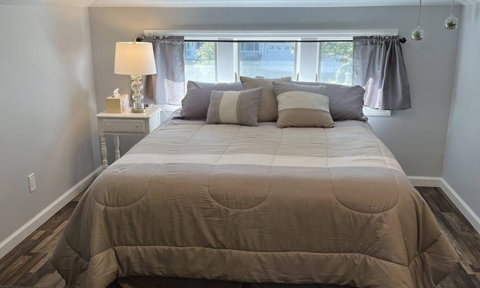 This serene, private suite is a quiet oasis on a cul-de-sac surrounded by trees. Great for business travelers or a couples retreat. Recently updated w/ private bath (standup shower). Located above a detached garage with a separate entrance. Free parking. 6 miles to White Plains airport. Close to trains for NYC. Featuring Serta queen size bed, iron, Roku TV, WiFi, dedicated workspace, Keurig coffee machine, microwave, mini fridge & semi private deck/pool.
