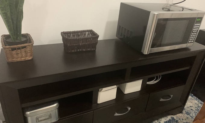 There’s fridge, microwave, air fryer Attention: There’s not a regular kitchen.