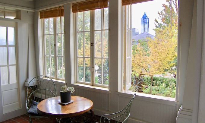 One bedroom apartment with lots of natural light, 10 foot ceilings, private entrance, sunroom, living room, small kitchen, large bathroom, walk-in closet and very small capacity stackable washer/ dryer. Sunroom overlooks front garden with downtown skyline views. Kitchen is open to living room which has french doors to sunroom. Bedroom is large with queen size bed and laundry in walk-in-closet. There is gated parking available and plenty of street parking. This apartment is on the first floor of a 100 year old house in the most diverse neighborhood in Atlanta - Historic Old Fourth Ward. Some people may be intimidated by the diversity of the neighborhood so don’t bother if you don’t like people that may different from you.