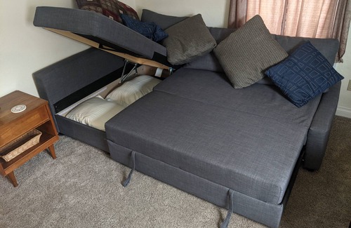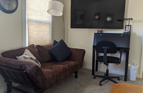 Updated one bed, one bath home with lots of off-street parking for multiple vehicles/RV. Central air conditioning, big screen TV, fold-out couch for more sleeping area. Fantastic for a couple or small family.