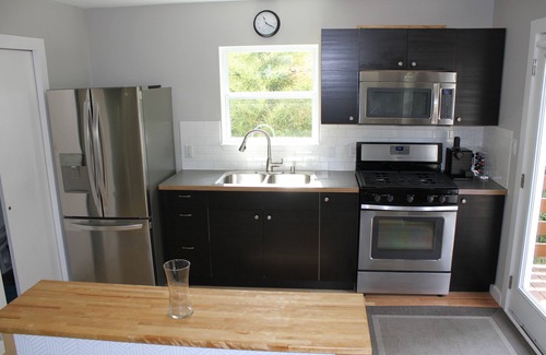 At this loft, you'll find yourself in a natural light-filled studio designed with your comfort in mind. You can enjoy the ample deck and chairs with a morning cappuccino in your hand. There is a queen sized bed and side tables with easy-access charging ports for your devices. The living area has a full size sofa-bed and a 40 inch, adjustable, wall-mounted, flatscreen television. Feeling hungry? A full kitchen awaits with stainless steel appliances, natural gas stove, microwave and other small appliances, including a Nespresso-cappuccino/espresso machine with supplies for your morning or afternoon coffee time. Finally, have a seat by the window; perfect for dinner or setting up to work from "home" for a while.