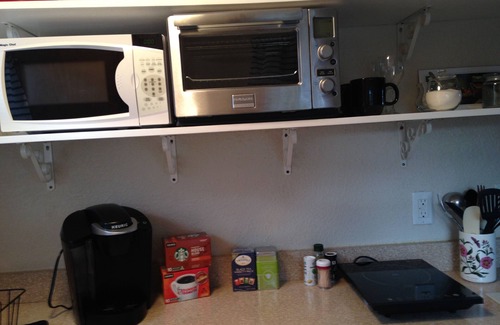 Cottage features a vaulted ceiling, comfy memory gel foam bed, convenient kitchen, private bath and plenty of storage. Completely furnished! Keurig Single Serve Coffee Maker or drip coffee maker, handy toaster oven-broiler, microwave, frig and induction cooktop. Linens, dishes, pots and pans, starter coffee and tea are provided.