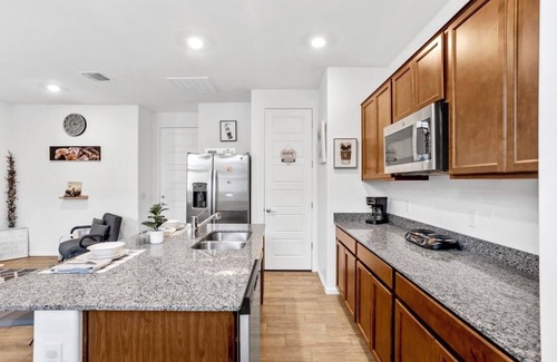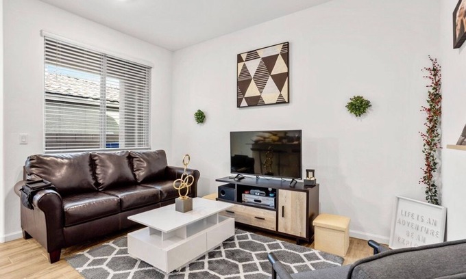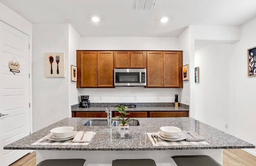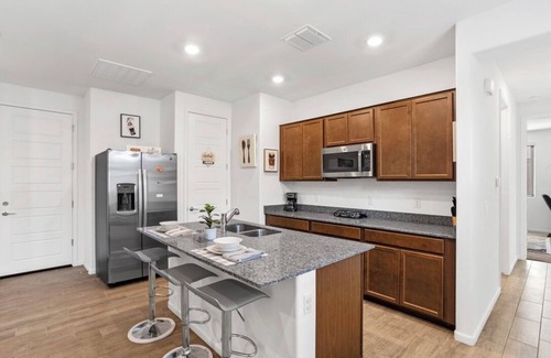 This beautifully furnished, spacious one-bedroom apartment features an open floor plan with a fully equipped kitchen, counter-height seating, and a cozy living room with a 48” Smart TV. The kitchen includes a refrigerator, dishwasher, Instant Pot, rice cooker, air fryer/microwave, George Foreman grill, blender, and toaster.
